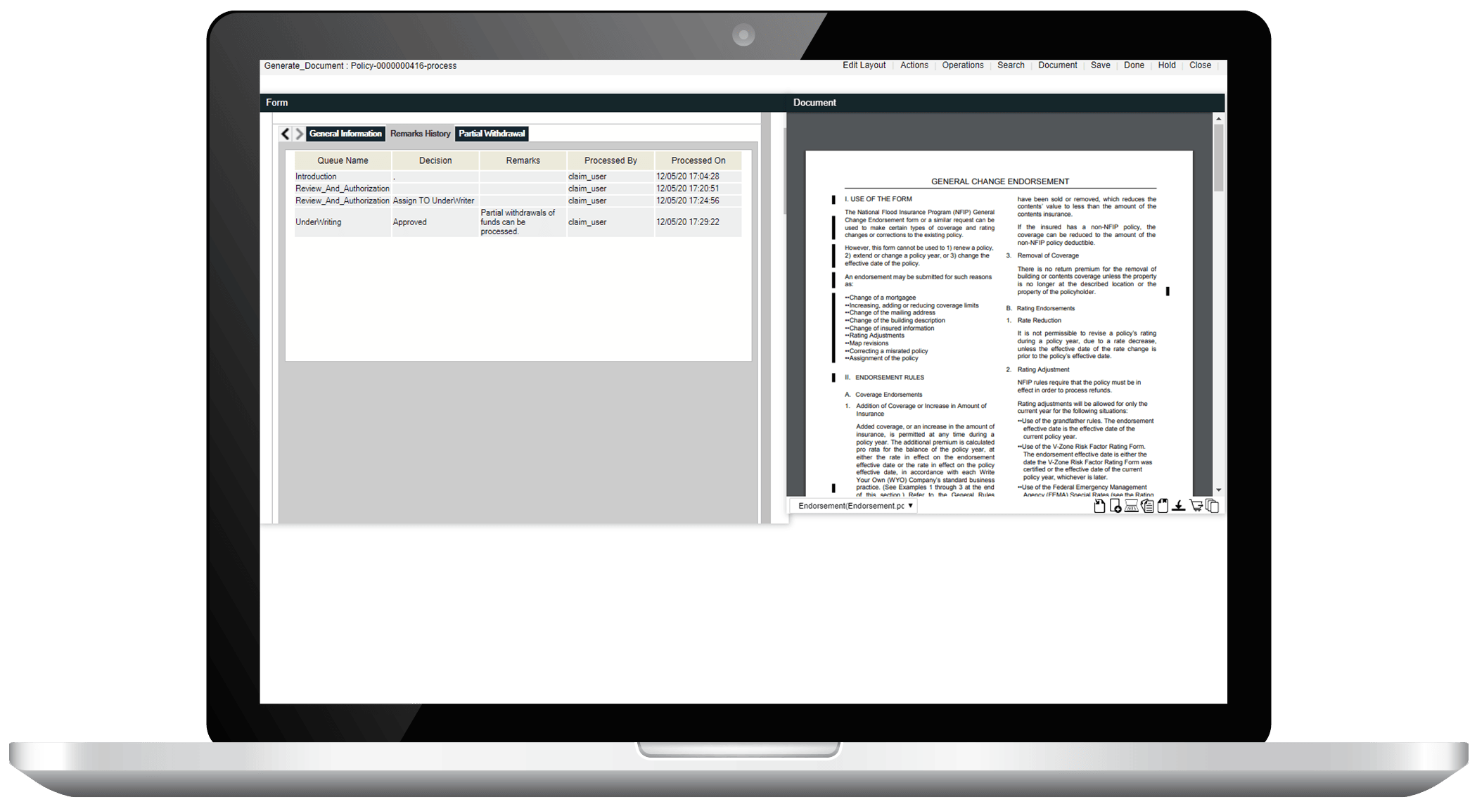 The policy servicing solution has the capability of template-based document generation that can be sent directly to the customer. The system provides faster and more effective customer communications such as renewal notices, endorsement letters, etc.